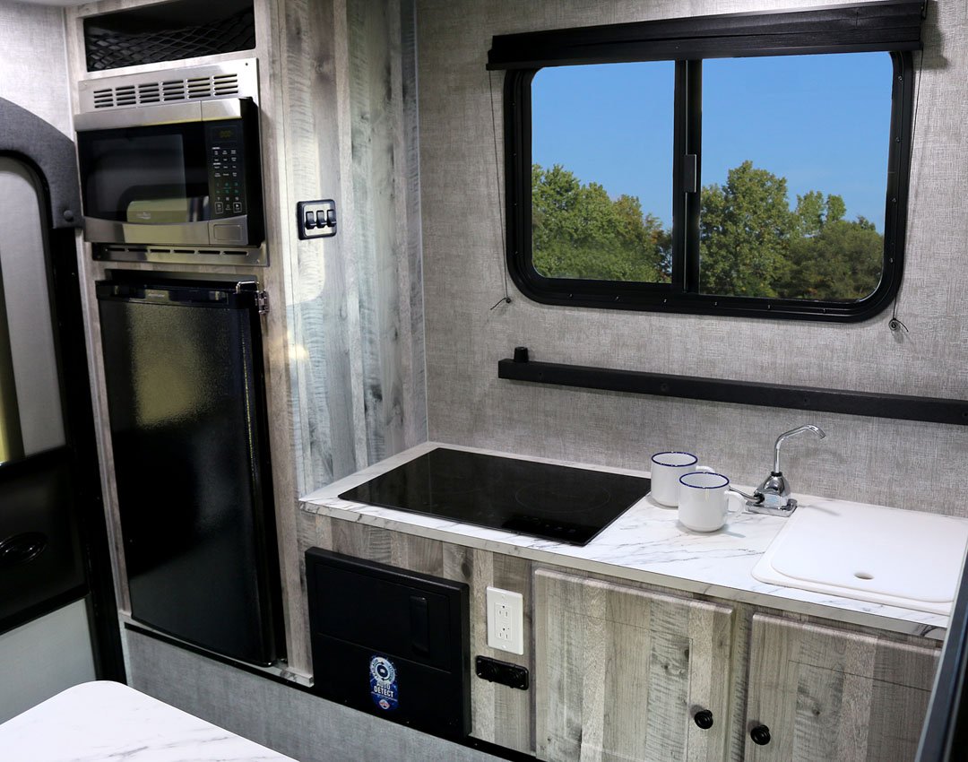 - Kitchen Area with 12V Refrigerator, Portable Cooktop and Sink