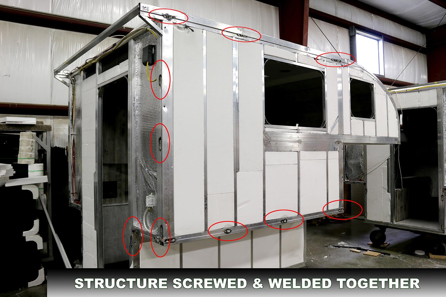 Each Soaring Eagle features an exterior profile that provides an aerodynamic, gas mileage-improving design, including a rear spoiler that also provides a great spot for our rear LED porch light and optional floodlights. The greatest feature of the Adlar is its construction. While most entry-level truck campers are held together with wood, staples, and a dream, Soaring Eagle Campers builds our rugged campers using all-welded, tubular aluminum construction, which is covered by seamless fiberglass. Not only is our construction stronger, but it is also lighter in weight and will stand the test of time. Rain, water, condensation, or moisture of any kind is often the main cause of the demise of a traditionally constructed camper. Soaring Eagle Camper owners have the confidence that their camper will stand the test of time, and the structure of their camper is not going to be compromised by moisture.